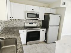 Private corner unit with screened in patio. Renovated 2/2 located on the 1st Floor, bright and spacious condo with an open-concept layout and tile flooring throughout . The kitchen has stainless steel appliances and a kitchen island. Enjoy peace of mind with impact windows throughout; full size washer and dryer.