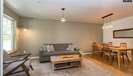 The bright living room overlooks open space, and the home can be offered with basic furnishings along with a fully equipped kitchen. A full-size washer and dryer are located in the unit, and central A/C keeps the space comfortable in the summer.
