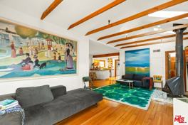 Beautiful and romantic canal front beach bungalow. Features include a spacious great room, fir wood floors, exposed beams, leaded stained glass windows and a wood-burning Franklin stove fireplace. The living area opens onto an expansive front deck overlooking the scenic Venice canals. Upstairs is the primary bedroom with a wrought iron fireplace and a private rooftop sun deck. Fully furnished.