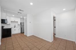 Interior features include tile flooring throughout and an updated kitchen with stainless steel appliances and quartz countertops. The spacious bedroom includes a walk-in closet, and the full bath features a tub/shower combo, new vanity, and modern lighting. A dedicated laundry room with washer/dryer hookups completes the space.