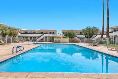 Great South Palm Springs Location! This 2 Bed 2 Bath condo has been extensively remodeled with a gorgeous kitchen and remodeled bathrooms. This home is directly across from the pool, BBQ Pits, and a beautiful greenbelt outside the front door. HOA includes, gas, trash, sewer, exterior maintenance and it has a covered reserved parking space. Community Amenities include, four Pools, two spas, a gyn, a billiards room and tennis courts. Enjoy this resort styled community close to downtown Palm Springs