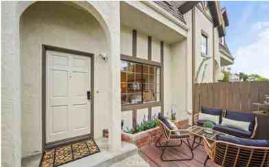 restaurants and grocery stores (such as Erewhon, Target and Trader Joe's). Enter through the private patio into the spacious living room, with ten-foot ceilings, recessed lighting and beautiful wood flooring. There is a spacious dining area off the newly renovated kitchen. The kitchen has stainless steel appliances, stone countertops with a breakfast bar and lots of storage. There is also a convenient laundry closet, complete with a new stackable washer and dryer. A powder room completes the main level of the home. On the second level, the primary suite has charming tree top views and a three-quarter bathroom with a skylight. There is a second bedroom off the hallway, plus an office/den and an additional full bath also with a skylight. Multiple built-in cabinets are also located in the upstairs hallway. Downstairs is a large, private attached two-car garage and there is a lovely pool in the complex. Please note that the property is staged in the photos but the townhouse is being leased unfurnished.