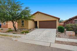 No Application Fees! Well maintained single level 3 bedroom, 2 bathroom Tucson home located in the desirable Sonoran Ranch Estates community. This bright and inviting home features tile flooring throughout all living and high traffic areas with carpeting in the bedrooms, upgraded doors and fixtures, ceiling fans in each room, 2 inch faux wood window blinds, and excellent natural lighting. The spacious open living room flows seamlessly into the kitchen, which offers extended countertop space, tile backsplash, a separate island with breakfast bar, upgraded cabinets, a pantry, and stainless steel appliances. The split floor plan includes a generous primary suite with a walk-in closet, double sink vanity, and step in shower. Washing machine and dryer are included, and the two car garage provides ample parking and storage. The backyard is designed for easy Arizona living with a covered patio, extended paver patio, pergola, and low maintenance desert landscaping.