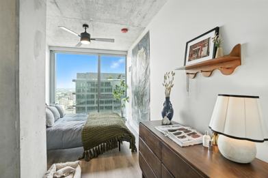 This one-bedroom plus den apartment at Flora offers a thoughtfully designed layout in the heart of Chicago’s West Loop, combining modern finishes with highly functional living space. Hardwood floors run throughout the unit, while the contemporary kitchen is outfitted with a gas range, dishwasher, and in-unit washer and dryer. The dedicated den provides a true bonus room—ideal for a home office, a creative studio/hobby room, or perhaps even a pet room that keeps your living area clutter-free.