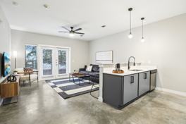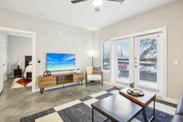 The open living area offers concrete floors, a Smart TV, queen sleeper sofa, and space to relax or entertain. The open-concept kitchen includes stainless steel appliances, stone countertops, and bar seating for four. A private patio with outdoor furniture provides a peaceful spot to unwind. Washer and dryer included.