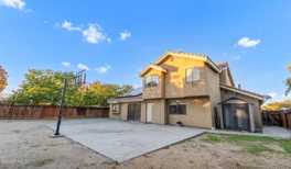 This two-story home offers 5 bedrooms and 3 bathrooms and is located in an established Palmdale neighborhood. Recent updates include new carpet and solar panels and the property features a large backyard. The kitchen includes a sloped ceiling, ample cabinet storage, a dishwasher, refrigerator, and gas oven and stove. The main level offers two spacious bedrooms and a full bathroom with access to the backyard. The living room features high ceilings, a fireplace, and large windows that provide abundant natural light. Upstairs includes two additional bedrooms, a full hallway bathroom, and a primary suite with a private bathroom and dual sinks. The backyard is generously sized, with a partially cemented area, a basketball hoop, and a storage shed.