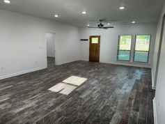 3-bedroom, 2-bath home featuring an open floor plan with spacious living and kitchen areas. Granite countertops throughout, including kitchen and bathrooms. Kitchen includes refrigerator, stove, and microwave. Built-in exterior lighting surrounds the home and operates on a timer. Washer and dryer hookups available. Primary bedroom includes a large walk-in closet. Exterior features include a large yard, covered front porch, and 2-car attached carport. Located in the Wooster School District.