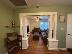 Huge living room has new flooring, and bright windows.