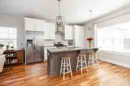 Modern Kitchen: modern grey granite cabinets, high-end dining table, stainless steel appliances including microwave, dishwasher, and refrigerator, with engineered hardwood flooring.