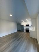 Open concept kitchen and living room, with high ceilings. Kitchen has S/S appliances (fridge, Stove/oven, dishwasher, microwave). Balcony off the living room.