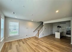 The stylish kitchen showcases quartz countertops, recessed lighting, stainless steel appliances, and a large breakfast bar, making it both functional and elegant. The expansive main living area provides ample space to relax or host friends and family.