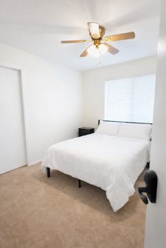 Private bedroom with a walk-in closet for $775/month. Shared bathroom with 1 roommate. Fully furnished with a Full sized bed, 12” Zinus foam mattress, and 43” Roku TV, plus access to a full kitchen, in-home washer/dryer, and high-speed 1Gbps internet in a quiet, clean, professional household.