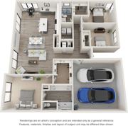 Each home includes a two-car garage and private driveway, including electric car charging ports. Inside, the contemporary appeal includes premium stainless steel appliances and quartz counters in the open kitchen design. Conveniences such as large walk-in closets and private patios or balconies also come standard.
