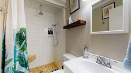 At the end of the hall, you will find a primary bedroom with en-suite bathroom including a gorgeous tiled shower and rain shower head. Down the hall there are 2 more bedrooms, one of which is a very oversized room, as well as another full bathroom with tiled tub.