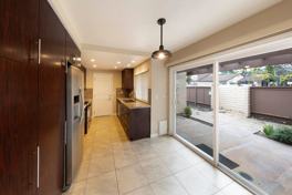 The formal living and dining areas are anchored by a cozy fireplace and provide direct access to an intimate rear seating area with peaceful views. The fully renovated kitchen is a standout, featuring dual farmhouse sinks, granite countertops, custom cabinetry with roll-out drawers, and a complete suite of stainless steel appliances, including a double-door refrigerator, gas stove, dishwasher, and microwave. A charming dining nook opens to a private patio through an oversized sliding door, creating seamless indoor-outdoor living. The washer and dryer are conveniently included.