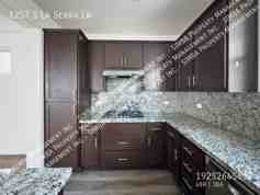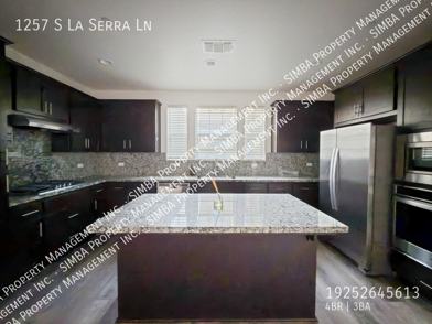The kitchen offers a functional and stylish setup with granite countertops, a large center island, dark cabinetry, and stainless steel appliances—ideal for everyday use and entertaining. Sliding glass doors provide easy access to the outdoor space, extending the living area and enhancing indoor-outdoor flow.