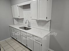 The kitchen features newly painted cabinets, updated backsplash, and sleek