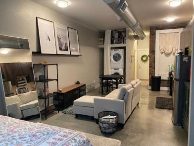 Bright Studio with 1 bath at Cincinnati Lofts - This unit is right off Vine St with a private security entrance and is equipped with finished concrete floors, updated appliances including a stainless steel refrigerator, electric stove, dishwasher, and brand new stackable washer/dryer! The full bathroom displays a tiled shower, area for a king bed, modern ceiling fan, walk-in closet and street views.