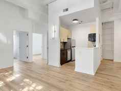 Unrivaled industrial elegance meets modern luxury in this stunning, sun-drenched loft. Soaring wood plank ceilings, massive original timber beams, and authentic exposed brick create a dramatic architectural backdrop for urban living. The expansive open-concept layout is highlighted by towering windows and striking black-framed French doors that showcase sweeping city views and iconic local landmarks. Thoughtfully updated throughout, the sleek kitchen features crisp white cabinetry and matte black hardware, offering a clean, modern contrast to the historic elements. The designer bathroom offers a spa-like retreat, featuring floor-to-ceiling stone-textured tile and a contemporary vanity. With its impressive scale, exposed ductwork, and integrated climate control, this one-of-a-kind loft offers a sophisticated and powerful city living experience.