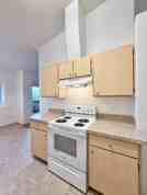 Unit #305b is a bright top-floor two-bedroom home filled with natural light and vaulted ceilings for an airy, open feel. The kitchen features light wood cabinetry and flows seamlessly into the dining area and spacious living room.