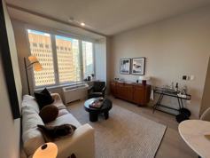 This flex one-bedroom offers thoughtfully designed layouts accentuated by built-in lighting and ceilings up to 10 feet high. The custom kitchen combines style and functionality with sleek cabinetry, paneled appliances, and quartz countertops. Bathrooms feature floating vanities and spa-inspired details, turning daily routines into a luxurious retreat. Modern amenities, including keyless entry, smart temperature control, and an in-unit Bosch washer and dryer, provide seamless, comfortable living.
