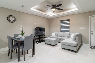 Highlight features of the home include a stylish open-concept kitchen and dining area equipped with stainless steel appliances, along with a cozy living room featuring recessed lighting and a ceiling fan. Both bedrooms provide comfort and space, complemented by modern bathrooms with glass-enclosed showers. This unit is also fully furnished and includes a washer and dryer for your convenience.