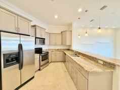 The first floor features an open kitchen and living area with travertine tile flooring and spectacular water views along with one guest bedroom. The kitchen offers ample counter and cabinet space, a dual-basin undermount sink, and stainless steel appliances including a double-door refrigerator, flat top range/oven, built-in microwave, and dishwasher.