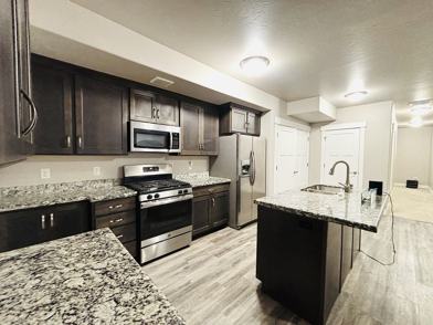 This spacious unit includes ALL UTILITIES INCLUDED & a private entrance. Open concept living area with carpet, modern kitchen with granite countertops, island, stainless steel appliances, and plenty of cabinet space. Master suite features double sinks, granite counters, soaking tub, walk-in shower, and huge walk-in closet. Additional bedrooms are carpeted with good natural light. Driveway parking available.