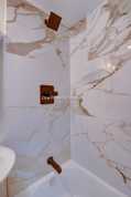 - Elegant bathroom with marble-patterned tile surround and bronze fixtures