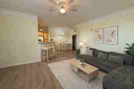 Located in the gated Runaway Beach Club resort community, this fully furnished 1-bedroom, 1-bath condo offers a bright, open layout with coastal-style décor. BRAND NEW FLOORS AND BATHROOM! NO CARPET AT ALL! The unit features a comfortable living and dining area, breakfast bar, and a functional kitchen with ample cabinetry and countertop space. The bedroom is spacious and well-appointed, with plenty of storage, and the bathroom is clean and well maintained. Residents enjoy resort-style amenities including two heated pools, kiddie splash pool, whirlpool spa, fitness center, indoor basketball court, clubhouse, business center, tiki bar, BBQ areas, on-site convenience store, complimentary Wi-Fi, cable included, free parking, and shuttle service to major theme parks. Access to the nearby Castaway Cove Adventure Park with additional pools, water slides, mini-golf, and more. Centrally located near shopping, dining, and attractions, offering true resort-style living in Kissimmee.
