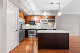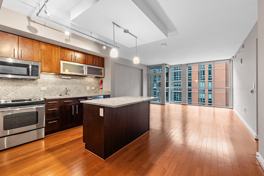 Loft-style Navy Yard condo in the Velocity with reserved garage parking spot. Floor to ceiling windows with integrated roller shades provide a lot of natural light. Open kitchen floor plan with large breakfast bar/island, beautiful granite counter tops and backsplash, stainless steel appliances, extra kitchen storage and wood floors. High floor covered courtyard-facing balcony you can use for plants, cafe table and chairs, etc.