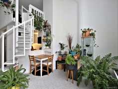 This Loft style unit in Port Chester cleverly maximizes its compact footprint through innovative design. The space features two loft areas accessible via spiral staircases, effectively creating two levels within the single-floor layout. Large windows dominate one wall, flooding the space with natural light and offering views of neighboring buildings. **** The main living area is multifunctional, combining living and sleeping spaces. A comfortable sofa serves as the centerpiece, complemented by a round coffee table and a vibrant area rug. The loft area, visible from below, provides additional sleeping or storage space. **** The unit's decor is characterized by a mix of modern and bohemian elements. A striking blue accent wall adorned with artwork and trailing plants adds visual interest and depth to the space. Throughout the apartment, an abundance of potted plants contributes to a fresh, organic ambiance. **** The kitchen, while compact, appears well-equipped and efficiently designed. The bathroom features clean lines with white tiles, a vanity with a granite countertop, and a combination tub-shower. **** Storage solutions are cleverly integrated throughout, making use of vertical space and maintaining an uncluttered appearance despite the limited square footage. The overall design successfully balances functionality with style, creating a cozy yet open feel in this small urban dwelling. ****