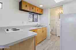 Bright, small studio with full bathroom. Plank wood style flooring, skylights in kitchen and bathroom bring in great light. North window has distant mountain view with trees. Mini split AC/Heat, cultured marble shower. Kitchenette has room for a small oven and storage cart underneath 2 burner cooktop. Storage closet (across from kitchen wall). Built with extra insulation for better temperature retention and noise reduction. Studio is approx. 12' x 32'. This studio has a gated, lockable, fenced entry with small outdoor space.