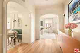 Presenting the most exquisitely designed, thoughtfully renovated residence in West Hollywood's full-service Granville Towers. This magnificently renovated fourth-floor home spans 1,177 square feet with one bedroom and one and a half bathrooms, and enjoys three exposures that fill the home with natural light throughout the day. No expense was spared in its transformation, from custom arches, molding, and paneling to a chef's kitchen with bespoke cabinetry and marble countertops, and a marble bathroom with custom brass shower enclosures and fixtures. The powder room is adorned with hand-painted de Gournay wallpaper, while abundant closet space, Bertazzoni appliances, and an in-unit stacked washer and dryer complete this extraordinary space. The top-to-bottom renovation includes new white oak flooring, plumbing fixtures by Catchpole & Rye, and Forbes & Lomax light switches. Lighting fixtures by Jamb London, Collier Webb, Kelly Wearstler, and Urban Archaeology are featured, as well as designer floor tile from Exquisite Surfaces. Custom linen treatments enhance every window. The Granville Towers is a historic French Normandy style condominium building in the heart of West Hollywood, originally built in 1930. Known for its dramatic turrets, lush gardens, and Old Hollywood charm, it has long attracted celebrities and creatives seeking privacy with character. Combining classic architecture with modern amenities, it remains one of the area's most iconic and prestigious residential addresses. Residents of The Granville enjoy gated underground parking, a secure gated entrance, and the services of a doorman, offering both safety and convenience. Perfectly situated, the building is close to West Hollywood's acclaimed restaurants, supermarkets, and vibrant nightlife.