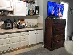 • Kitchenette: Features essential appliances (refrigerator, flattop burner & microwave oven), perfect for simple meal prep.