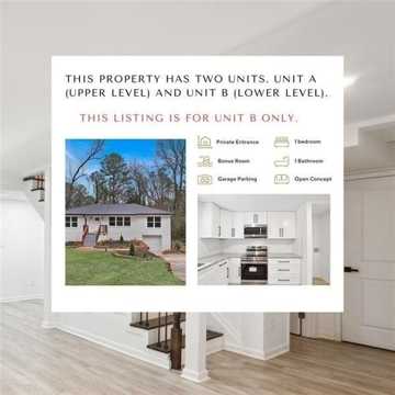 Lower Level Basement Unit in Desirable Candler-McAfee Neighborhood featuring modern updates, stainless steel appliances, & in-unit washer and dryer for added convenience. There's a bonus room that can be another bedroom or large office space. Full access to the garage with a private entrance + punch pad locks. Ring cameras provide peace of mind and an extra layer of security. Lease Details: Rent: $1400 Security Deposit: $1400 Utilities: Fixed $250 utility cap (water, gas, sewage, trash, wifi) will be applied to rent (monthly total $1650) Application Fee: $50 Lease Term: 12 month available, month to month available Available: February 14th Credit Score Requirement: 600+, no evictions Income Requirement: 3x monthly rent Background Screening Required All future tenants 18+ must apply Pets allowed with non refundable deposit of $300 per pet and $40 additional monthly. Please note that this property has two units. Unit A and Unit B. This listing is specific to Unit B (lower basement unit). The property is currently occupied by tenants. Please schedule an appointment to view the property. This property is not advertised on.