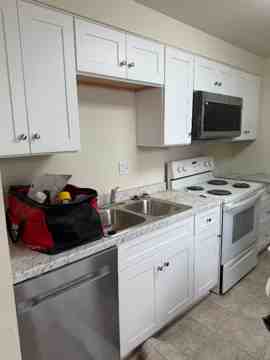 The well-equipped kitchen boasts essential appliances, including a dishwasher, microwave, range oven, and refrigerator (brand new cabinets and appliances).