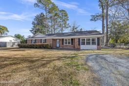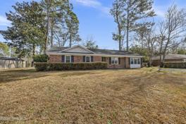 Beautifully updated brick ranch in Kings Grant! This 3-bedroom, 2.5-bath home sits on a spacious lot with mature trees and lawn. It features a covered front porch entry with an open floor plan ideal for both everyday living and entertaining. There is engineered hardwood flooring in the foyer, living room and office. The kitchen seamlessly connects to the dining and living areas and includes tile flooring, a breakfast bar overlooking the living room for additional seating, granite countertops, matching black appliances, tile backsplash, pantry and access to the covered back patio, and back yard with fire pit. The laundry room, equipped with washer/dryer and 1/2 bath are just off the kitchen. The large office has glass French doors, built in shelving and a storage closet. The primary bedroom offers a private ensuite bathroom with walk in tile shower, while the remaining 2 bedrooms provide flexibility for guests and share the full hall bathroom with tub/shower combo. Step outside to enjoy the fully fenced backyard, offering plenty of privacy. The outdoor space includes a wired shed-perfect for projects or extra storage-and a convenient outdoor shower for rinsing off before heading indoors. Don't miss the opportunity to make this your next home! No smoking. Pets negotiable. Available immediately.