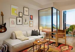 – Second bed is in a flex room with retractable walls that can be opened up to the living room area, with a hideaway bed that converts into a table.