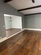 The heart of the home showcases a thoroughly updated kitchen with brand-new stainless steel appliances. The inviting living room makes a statement with its impressive brick chimney and dark wood ceiling beams, while vaulted ceilings and large windows create an abundance of natural light. A versatile sunroom offers flexible space, perfect for formal dining, a playroom, or an entertainment area. The primary bedroom includes a generous walk-in closet, and both bathrooms have been stylishly updated.