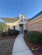 Well-maintained rental home featuring a double car garage with automatic opener and full sprinkler system. Inviting entry leads to durable cement wood flooring throughout the kitchen, breakfast area, family room, foyer, and both downstairs bedrooms. Spacious walk-in laundry room offers laminate flooring, built-in cabinetry, and a convenient mud sink. The kitchen includes a full appliance package with refrigerator, microwave, drop-in oven, dishwasher, and garbage disposal, along with a double pantry for ample storage. Breakfast area includes a mounted TV that will remain. Gas log fireplace highlights the family room. All window blinds remain. The primary suite is located downstairs and features a private door opening to the brick terrace, a generous walk-in closet, double vanities, jetted tub, separate shower, and a bonus nook ideal for a home office or sitting area. A secondary bedroom downstairs is located off the front foyer and has access to a full bath. Upstairs offers a private third bedroom with its own full bath featuring laminate flooring and a tub/shower combination, plus additional floored attic storage space accessible from the bedroom. All bedrooms are equipped with ceiling fans. Carpeted stairs lead upstairs. Outdoor living is a standout with a huge covered porch, concrete patio, fully fenced backyard, and mature landscaping with established flower beds—perfect for relaxing or entertaining.