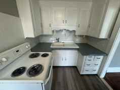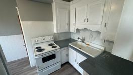 The spacious eat-in kitchen comes equipped with white cabinetry, white appliances (including electric stove and refrigerator), sleek gray countertops, and durable vinyl flooring - perfect for everyday cooking and dining.