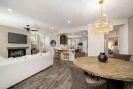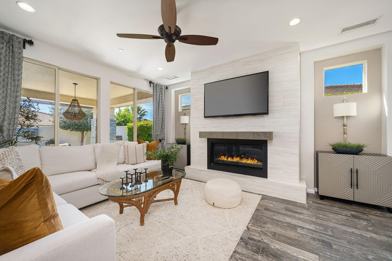 Offered- For Lease or Sale. Move-in ready and beautifully finished, this 2BD/2BA + office/den home is located in the highly sought-after Trilogy Polo community. This popular Monaco model has been meticulously maintained and showcases premium finishes throughout. Step inside to discover a thoughtfully designed floor plan featuring a great room with a decorative fireplace that flows seamlessly into the dining area, den, and updated kitchen--creating an ideal setting for both everyday living and entertaining. The kitchen is appointed with stainless steel appliances, quartz countertops, a designer backsplash, and enhanced cabinetry with ample storage. Designer touches throughout the home include recessed lighting, wood shutters, tile flooring in the main living areas, new carpet in the bedrooms, and elegant two-tone paint. The primary suite offers a peaceful retreat with a walk-in closet, dual vanities, quartz countertops, and an oversized tiled shower with bench seating. A large rolling wall of glass opens to the private outdoor living space, creating a seamless indoor-outdoor experience. The backyard is perfect for relaxing or entertaining, featuring a covered patio, firepit, and soothing fountains in both the entry courtyard and backyard.
