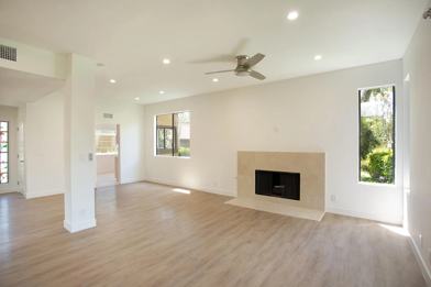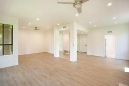 This large two bedroom, two bath home features a spacious open living plan with a shared living room / dining room and an adjacent den or office space. The living space opens to a large stone patio enclosed by a wood fence and an extra storage closet.