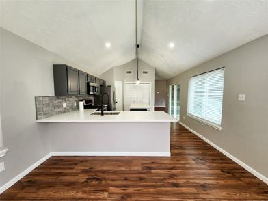 This beautifully renovated 3-bedroom, 2-bath home features stylish contemporary upgrades. The living room showcases an arched ceiling and a charming brick fireplace. A versatile flex room offers the option to be used as a home office, or an additional bedroom. The island kitchen truly stands out with Quartz countertops, stainless steel appliances, deco backsplash, modern lighting, and a sleek matte black faucet. The primary bedroom is privately situated on the opposite side of the home. The primary bathroom is stunning, featuring dual sinks, modern mirrors, and a beautifully designed shower with black-and-white tile and matte black finishes. Two generously sized secondary bedrooms, a brand-new black modern washer and dryer, dual patio entrances, an enclosed covered patio, and a backyard with garden space round out this exceptional home. Located near 99, I-45 N, The Woodlands Mall, restaurants, & George Bush Int'l Airport. Low deposit plan! Mo Concierge Service. Housing not accepted