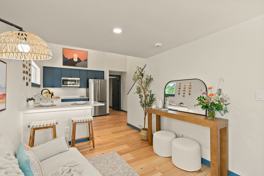 Inside, the lofted queen bedroom maximizes living space while a walk-in closet on the main level provides extra storage. The bathroom includes a lighted vanity mirror and shower. In the kitchen you'll find quartz countertops, energy-efficient induction cooktop, microwave, and full-size refrigerator for all your cooking needs. Private lighted entrance and one dedicated alley parking space with additional street parking available. A must see!