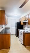 - Kitchen provides an oven/range, full-sized refrigerator.