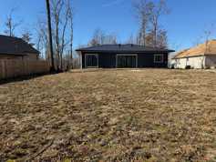 Step outside to appreciate the modern curb appeal: a sleek dark exterior with metal roofing accents, a spacious driveway leading to an attached garage, and a private backyard backing onto natural surroundings with room for outdoor enjoyment. The home sits on a serene lot with wooded views, offering tranquility while being part of Bella Vista's vibrant community.