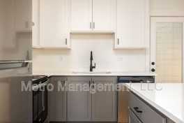 • Modern kitchen with quartz countertops, stainless steel appliances, and custom cabinetry