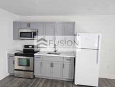 The bathroom has been fully renovated and includes a contemporary vanity and a glass-enclosed walk-in shower. The unit offers a bright living space, ample storage, and a clean, modern feel throughout.